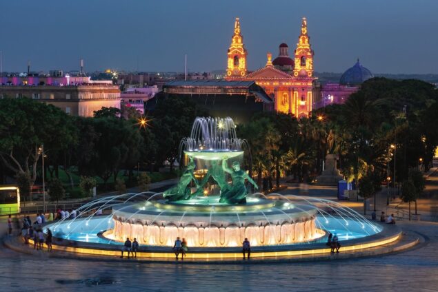 To jeden z najbardziej charakterystycznych punktów Valetty i tradycyjne miejsce spotkań. Znajduje się tuż przed murami miasta, w pobliżu City Gate. Fontanna przedstawia trzech trytonów, mityczne postaci będące połączeniem człowieka i ryby, znane z mitologii greckiej i rzymskiej. Trytony podtrzymują dużą, okrągłą misę, a cała konstrukcja spoczywa na okrągłej podstawie. Fontanna robi wrażenie, symbolicznie nawiązując do bogatej historii wyspy.