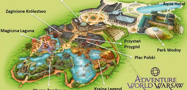 W pierwszym etapie ma powstać park tematyczny z prawie trzydziestoma atrakcjami, do tego dwa hotele, duży auapark, część galeryjna ze sklepami i restauracjami oraz kinami. W Adventure World Warsaw znajdziemy pieć tematycznych stref: Adventure Harbor, Creature Lagoon, Castle Island (będzie można spotkać się tu z Merlinem, Królem Arturem, wiedźmami i smokami. Będzie to wyspa pełna średniowiecznych legend i mitów), Land of Legends i Polski Plaza – ta ostatnia strefa swoją architekturą będzie przypominała polskie starówki. Będzie tam można także spotkać postaci z polskich legend i bajek, m.in. takie jak Pan Twardowski. Wśród atrakcji planowane są między innymi: rollercoaster boomerang, karuzela waveswinger czy zjeżdżalnia flume.