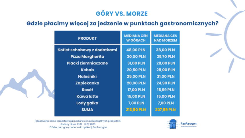 – PanParagon to aplikacja, która służy zarówno do przechowywania paragonów, jak i wyszukiwania promocji. Co miesiąc użytkownicy dodają do niej średnio około 2 miliony dowodów zakupu. Dzięki temu możemy analizować ceny produktów i obserwować zmieniające się trendy konsumenckie. W związku z trwającym sezonem wakacyjnym postanowiliśmy przyjrzeć się kosztom jedzenia w popularnych miejscowościach górskich i nadmorskich. Do zestawienia wybraliśmy typowe letnie przekąski, dania i napoje dostępne w obu regionach, co pozwoliło nam na wiarygodne porównanie cen – mówi Antonina Grzelak z aplikacji PanParagon.