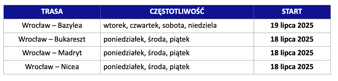 Od lipca 2025 roku Wizz Air będzie realizować loty z Wrocławia do Bazylei (Szwajcaria) cztery razy w tygodniu, a także do Bukaresztu (Rumunia), Madrytu (Hiszpania) i Nicei (Francja) – trzy razy w tygodniu. Bilety są już dostępne na stronie internetowej wizzair.com oraz w aplikacji mobilnej Wizz Air.