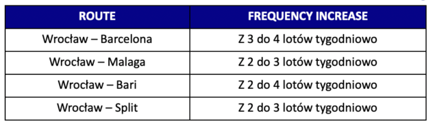 Wraz z przydzieleniem drugiego samolotu Airbus A321neo do bazy Wizz Air we Wrocławiu już w lipcu 2025 roku, linia zwiększy również częstotliwość lotów na istniejących trasach: do Barcelony (z 3 do 4 lotów tygodniowo), Malagi (z 2 do 3 lotów tygodniowo), Bari (z 2 do 4 lotów tygodniowo) oraz Splitu (z 2 do 3 lotów tygodniowo).