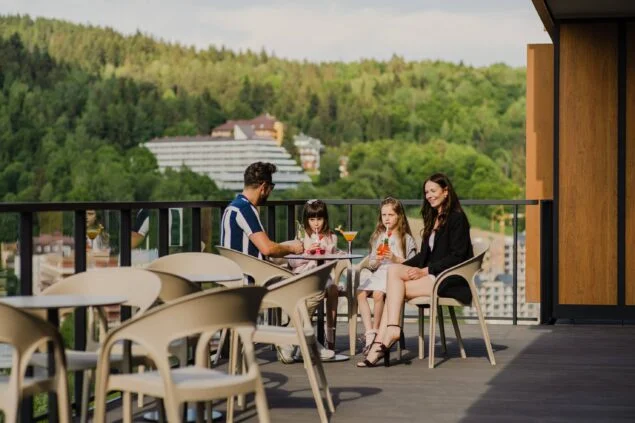 Przy wykończeniu wnętrz wykorzystano materiały najwyższej jakości: naturalne kamienie, drewno, szkło – z niezwykłą dbałością o detale. Wszystko tworzy spójną całość. Hotel położony jest u podnóża góry Krzyżowej, dzięki czemu w sezonie zimowym goście mogą cieszyć się bliskością stoku narciarskiego, a latem otaczającymi lasami i wspaniałymi górskimi widokami. Kolory ziemi, wszystkie w odpowiedniej tonacji, subtelnie wkomponowane w różne strefy hotelu, pozwalają odpocząć zmysłom i w pełni zrelaksować się.