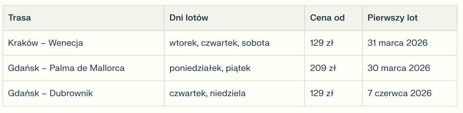 Nowe połączenia jeszcze szerzej otwierają polskim podróżnym dostęp do popularnych destynacji miejskich i wypoczynkowych w Europie. Krakowska nowość do Wenecji pozwoli szybko dotrzeć do jednej z najpiękniejszych włoskich metropolii, znanej z romantycznych kanałów i bogatego dziedzictwa kulturowego. Połączenie z Gdańska na Majorkę to natomiast wygodna opcja dla osób szukających słońca na Balearach, a rejsy do Dubrownika – miasta wpisanego na listę UNESCO – ułatwią podróże na adriatyckie wybrzeże Chorwacji także poza sezonem letnim.