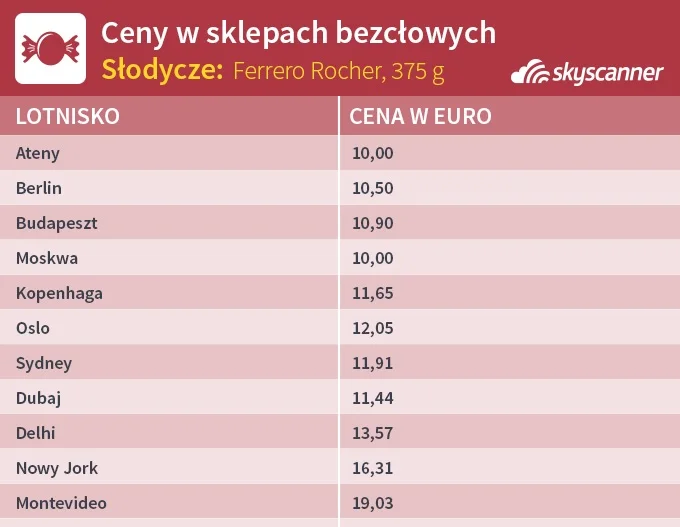 Gdzie znajduje się najtańszy sklep wolnocłowy? Skyscanner porównał ceny wybranych produktów z różnych kategorii, które można znaleźć w każdym sklepie wolnocłowym: alkoholu, tytoniu, słodyczy i perfum. Ceny zostały zebrane z różnych lotnisk na świecie i przeliczone na euro, w momencie gdy kurs średni wynosił 4,16 w stosunku do złotego.