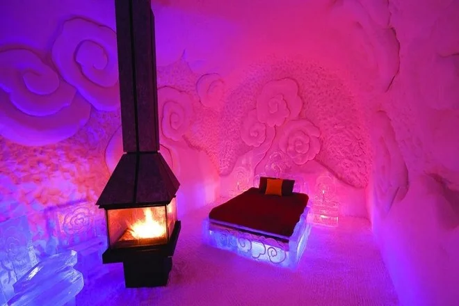 W całości z lodu, jedyny w swoim rodzaju. Lodowy hotel topi się z końcem marca, do tego czasu można tam skorzystać z pakietu atrakcji, który obejmuje apartament z kominkiem, butelkę lodowatego cydru, płatki róż i świece. Plus pudełko rzeźbione z lodu, w którym można oferować pierścionek zaręczynowy.