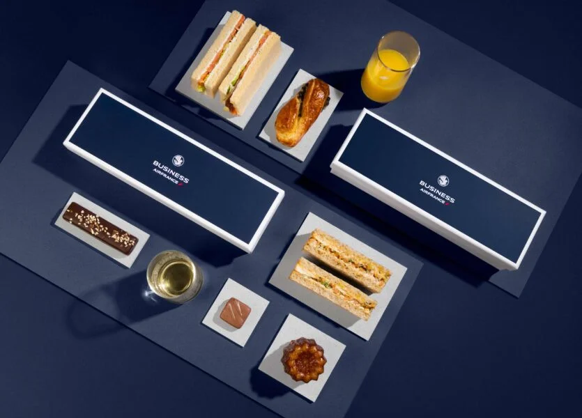 Menu w pudełku zmienia się co miesiąc. Towarzyszą mu starannie wyselekcjonowane wina i szampan – teraz serwowane w szkle* oraz szeroki wybór gorących i zimnych napojów bezalkoholowych. Dzięki nowemu menu, Air France podnosi standard swoich usług, promując jednocześnie francuską kuchnię.